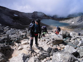 お天気は午前中だけと思っていただけに、ガスに覆われたりしたものの、紅葉は充分に楽しむ事が出来た。ハイカーや観光客が入り混ざっての歩きだけに、砂礫や岩がゴロゴロしている所では、擦れ違い様を慎重にせねばならなかった。