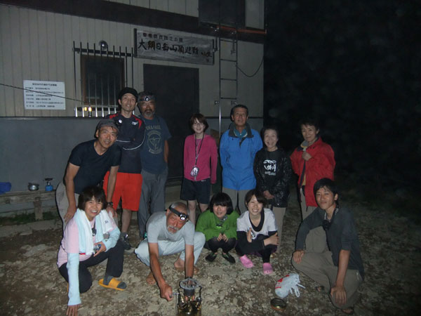| 特大ラジュースを囲んで、大朝日岳山頂避難小屋の宴。 |