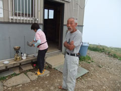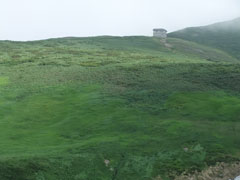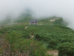 | 明日、また山頂に来る事にして・・ | 避難小屋が見えて来た。 | 山頂から避難小屋まで10分前後。 |