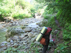 すぐに吊り橋がある。 | 朝日川に沿って2時間以上歩く。 殆ど高度は上がらない。 |