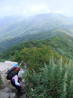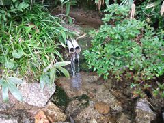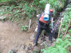 | 避難小屋がだんだん遠くなる。 | 20分ぐらいで水場の銀玉水に・・・ | 美味しい水を充分に補給する。 |