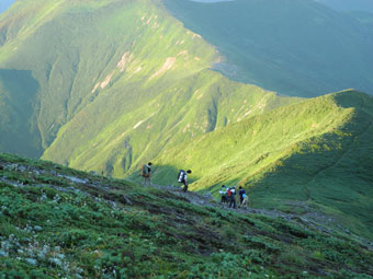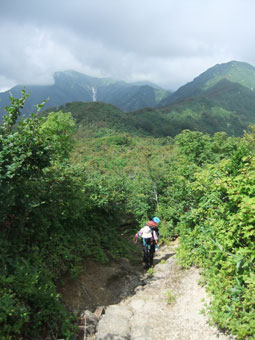 | 一番奥の尖った山が祝瓶山(300名山) | 御影森山経由で朝日鉱泉を目指す 東京農大パーティー。 |