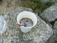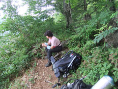 | 標高993mの三角点。 | 三角点から10分ほど行った所で、 果物を食べて休憩。 |