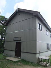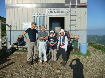 | 出発前に管理人の阿部氏と記念撮影。 | お世話になった大朝日岳山頂避難小屋を振り返る。 |