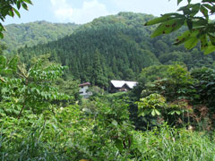 | 朝日鉱泉へ杉林を行く。 | 弘法水(湧水)で喉を潤す。 | ようやく朝日鉱泉が見えて来た。 |