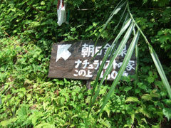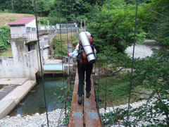 | 最後の吊り橋を渡る。 | 朝日鉱泉まで、あと250歩。 | ナチュラリストの家・朝日鉱泉。 |
