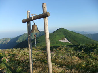 | 山頂から再び避難小屋へ・・・ | 避難小屋前にある鐘越しに、 西朝日岳・竜門山方面を望む。 |