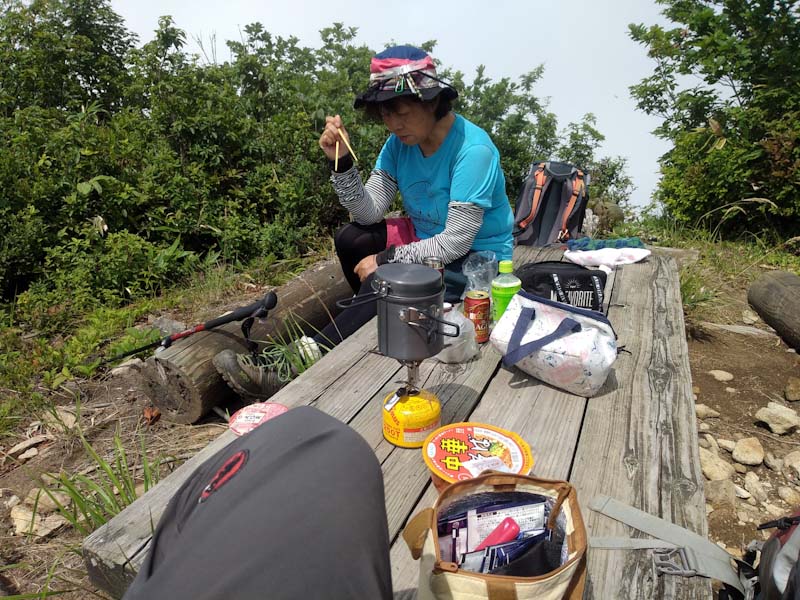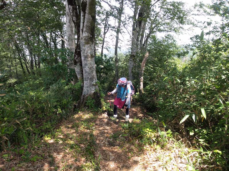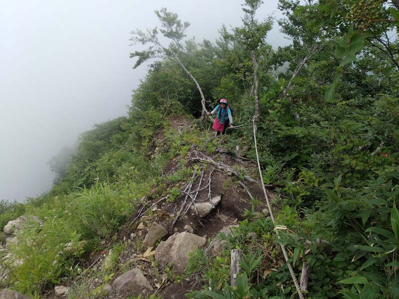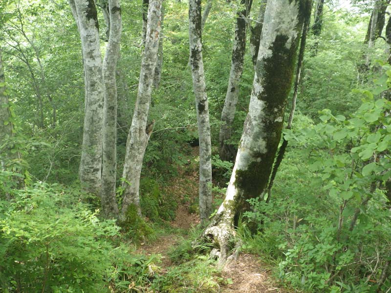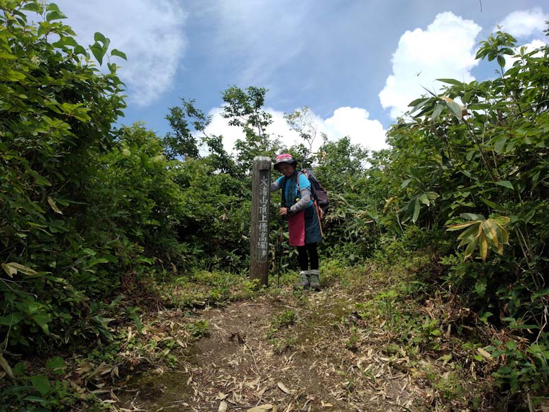 短いコースだが、お天気なら雨飾山の大展望台なんだからそれなりに良い。ブナ林も気持ちが良い。そして、崩落地帯を避けて新たに登山道が刈り上げてあった。標柱と櫓がある山頂に先人がおられたので、それを避けて、戻った所にある東峰で休憩とした。展望は全く無かったが、それでも、4回目の山頂に立った事になる。