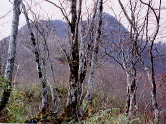 | 大渚山頂上で | 展望台で頂上の標柱と | ブナ林の間から大渚山を振り返る |