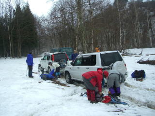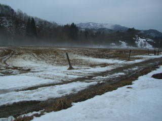 | a.m.8:30 迷走しながら、岩井谷の奥に入る。 | 農耕地の関係上、周りがぬかるんでいた。 |