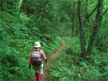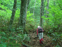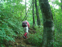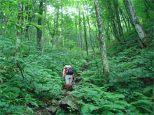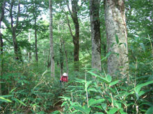 | 鬱蒼としたブナ林の中へ・・ | いつもブナ林を見慣れているので、 差ほど驚かない。 |