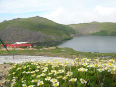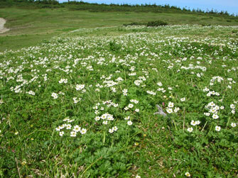 | p.m.3:00 小蓮華山でエネルギー補給。 | 白馬大池が見えるのであるが、遠~い。 | チングルマ越しの白馬大池。 |