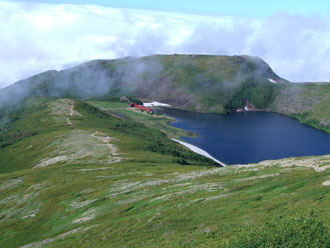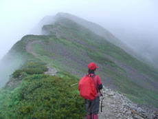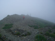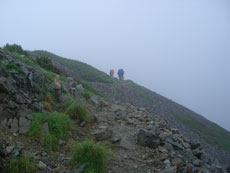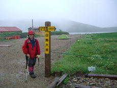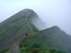 黒い雲に覆われていた雪倉岳も、いつの間にか白い雲の上に、大きな山容を現した。暑い西日を受け汗を流したが、蓮華温泉に近付く頃は、朝方と同じで、また霧の中に埋もれてしまった。でも、ヘッドランプを使う事なく無事下山し、駐車場でコーヒーを湧かしながら後片付けをし、またまた視界の悪い中に車を走らせた。