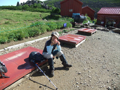 | 白馬大池山荘前のベンチで、桃にかぶりつく「山ノ神」 |