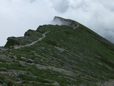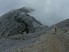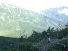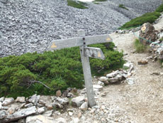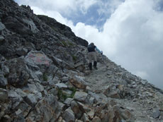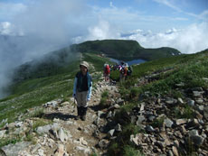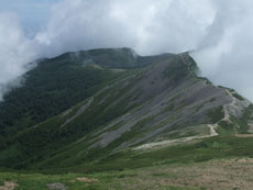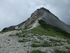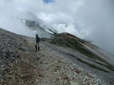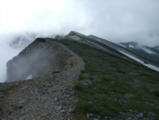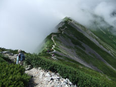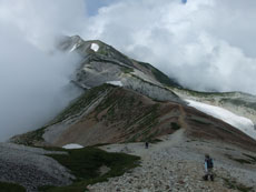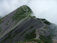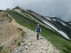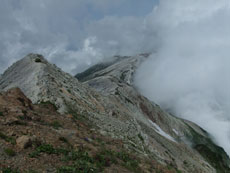 | 晴れておればステキな稜線歩きです。 | 振り返れば、遠くに白馬大池が見える。 | 本当の小蓮華山は、崩壊の 恐れで立ち入り禁止状態。 |