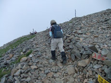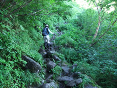 | 白馬大池までは大きな石の上を行きます。 | カラマツソウがたくさん咲いていました。 | 遭難者を捜索中の長野県警のヘリが、 白馬大池周辺を何度も旋回していました。 |