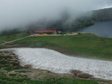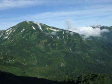 | 朝日岳方面に黒い雲が掛かっていた。 | 天狗ノ庭は雰囲気の良い所です。 | 雪倉岳が目の前に大きく見えます。 |