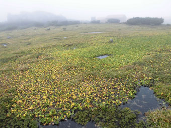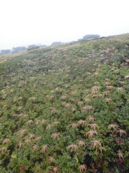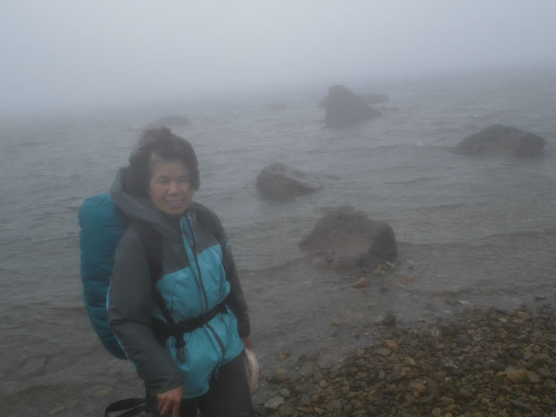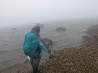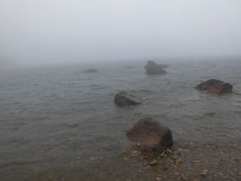 蓮華温泉・白馬大池間の往復で出会ったのは、この方々だけ。やっぱり台風というのが頭にあって、少ない・来ないのだと改めて思った。大池の平原に出ると、一層その風の凄さを感じた。「帽子が飛ばされる。」 「身体が前に進まない。」 状況で、もうこの時点で、白馬の山頂どころか、白馬乗鞍の山頂へも諦め、大池の淵まで行く事だけにした。大池の周りの視界も悪く、波だけが荒々しく、まるで海の波に感じたのである。