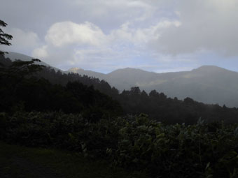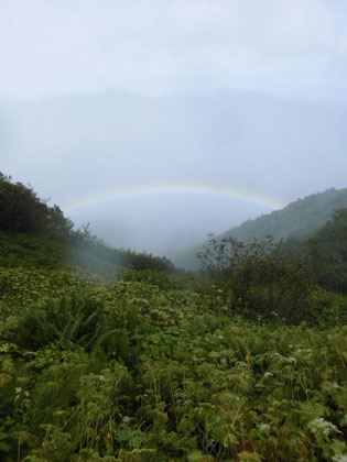 何にも見えない濡れた山道を戻るのであるが、高度が下がる事に、暑くなってくる。「天狗の庭」を過ぎると、時々、薄っすらと、向かいの稜線が見えて来る(雪倉山・赤男山・朝日岳など)が、また、パッと消える。その内虹が出たりした。そして、案の定、いつもの通り、降りる頃、降りてから晴れるというパターンとなった。