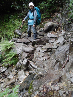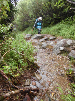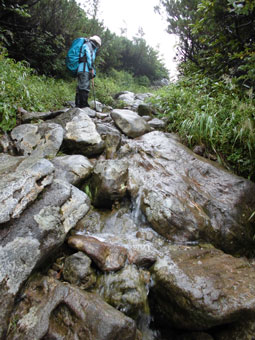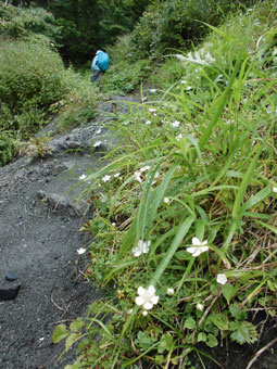 雨は、そんなに酷くなかったが、風が凄かった。「いつ止めてもいい。」 と言う「山ノ神」であったが、白馬乗鞍岳でもいいから、ピークに立ちたいのが私。「天狗の庭」を過ぎたしばらくした所で、上から降りてきた老夫婦に出遭った。「2泊する予定で白馬に登る予定であったが、小屋の人が登れないから帰れと追い出された。」 と、ユーモアとも、怒りとも取れる言い回しで私達に告げた。「とにかくすごい風・・」 を強調していた。