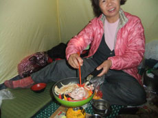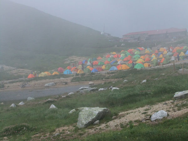| お天気の悪い中、12時間近くを要し、ようやく双六のテン場に到着です。 |