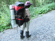 8/15 荷を詰め込んだら、私が24キロに、「山ノ神」が13キロになった。「美味しい物を食べて、暖かく快適に過ごしたい。」 のであるが、「なるべくスリムに行こう。」 と言っているのに、大量の荷になってしまった。おまけに、新穂高を発つ時に、杉原女史への荷(結果的にはお会い出来なかった。その荷は、下山してくる彼女への果物のプレゼント) も、持たされる羽目になったのであるから、苦戦が予想された。