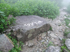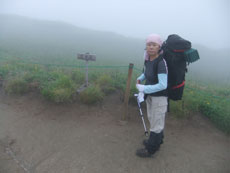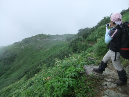 尚も雨が続いたが、黙々歩く事にした。「山ノ神」が、突然、「あっ、山崎さん」 と登って来る人に声を掛けた。「岩崎です。」 の答えが返ってきたが、「山ノ神」は、「ごめん! 写真を・・」 と、通常の尻込みが、何処へ行ったのかと思うほどの度胸で、岩崎元郎氏と写真に収まった。