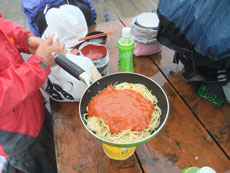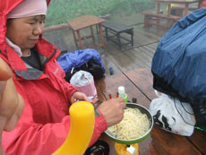 鏡平でパスタを作り始めたら、突然、強い雨が降り始めたが、「忍の一字」で最後までやり通した。