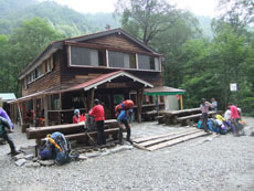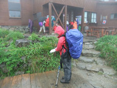 歩行が順調に推移した事もあり、鏡平で大休憩を目論んでいた。豊富な?食材の中から、パスタを茹で始めてから、大粒の雨が降り出した。周りの人達が一斉に山荘に逃げ込んだが、我々だけが、じっと、そこで耐え忍ぶ形となった。しかも傘一本である。山荘前の人達の視線を気にしながら、意地だけになったような気がするが・・・・