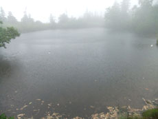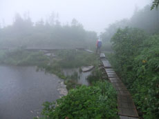 ガスの中、ひょうたん池に掛かる橋を渡る。 |