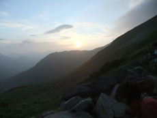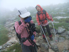 | 山頂直下で、「元さん~」と声を掛けて 頂いた。飛越新道からやって来た喜多 さん母娘である。黒部五郎岳から一気 に新穂高へ降りると言っておられた。 |