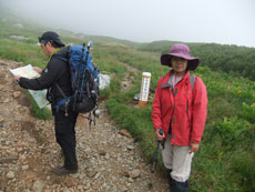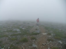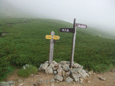 ガスに覆われながら、 なだらかな稜線を長く歩いた。 |