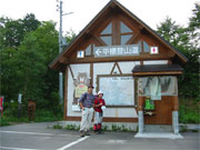 ステキで清潔感溢れる東屋のトイレに、「平標山登山道」と大きな熊の絵と共に熊注意!の標識をバックにまずは記念写真を撮り、取付け道路の指示に従いふれあい橋を渡り、2~3分程進んだ林道の右手に登山口があった。