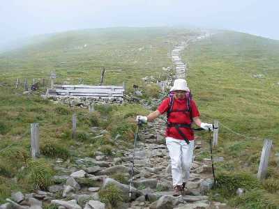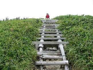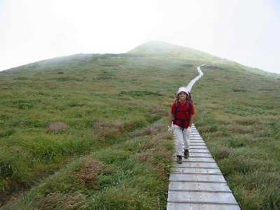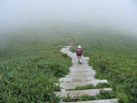 ガスが途切れた稜線に、幾つかのピークが見える。どれが頂上なのだろうと先を急ぐが、手前のピークで、直角的に左に導かれた。稜線とは言いにくい、なだらかな尾根を一度軽く下って階段状の木道を登れば、先程眺めた左から二つ目のピークが頂上である。