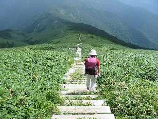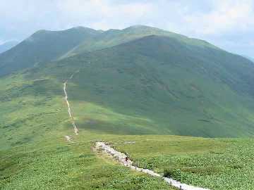 しかし、この先は、土樽からと、平標山ノ家から来る道を集めて、長い木道が連なる「仙ノ倉山」へと導いているのである。この平標山から見る「仙ノ倉山」は、木道と広い風衝草原だけで「苗場山」を思い出した。地糖こそないが、最盛期のお花畑や、秋の草紅葉の光景を、連想するだけでも、楽しくなってくる程である。