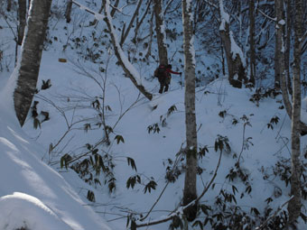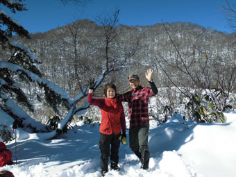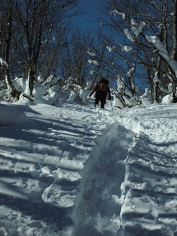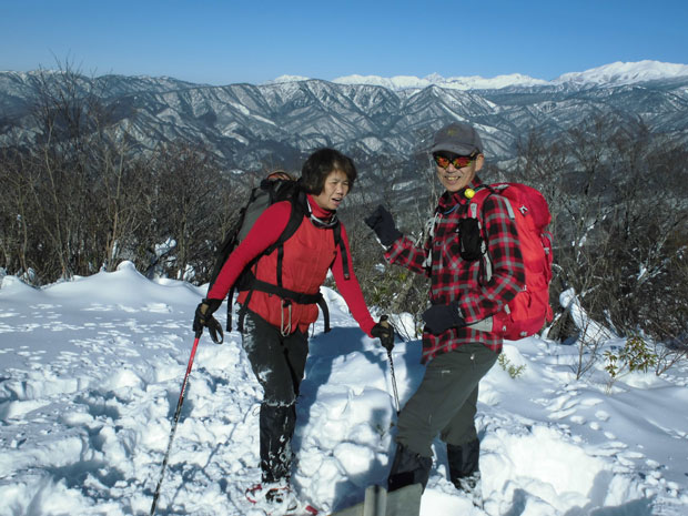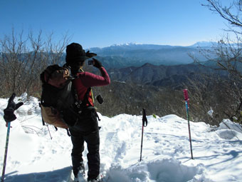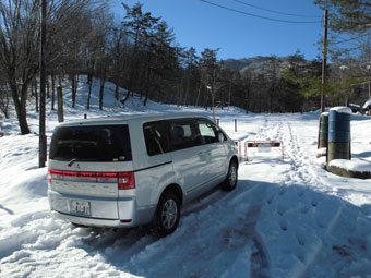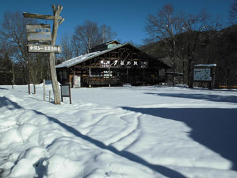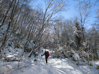 登山口の山之村・夕顔の駅の気温は、-5℃。前日のトレースに従わなければいけないちょっぴり不満?があったとは言え、モナカ雪状態では助かった感もある。予想以上の積雪(60センチ)に、カンジキを用意していたが、スノーシューにすれば良かったと思わずにはおれなかった。