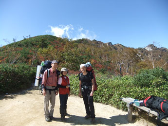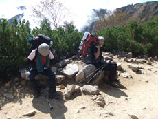 | 重荷を担いで、まずは駐車場から | 中房温泉登山口 | 第1ベンチで・・・ |