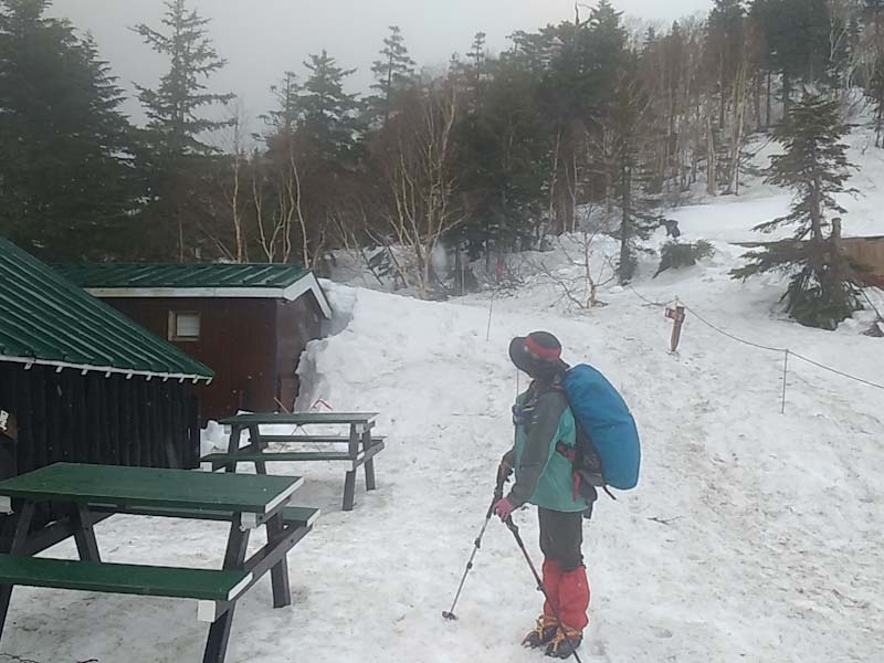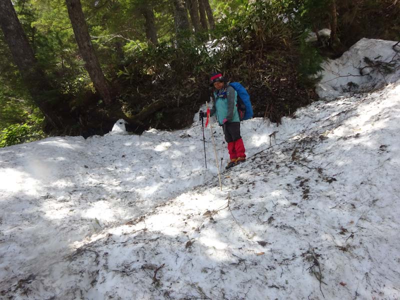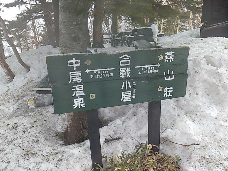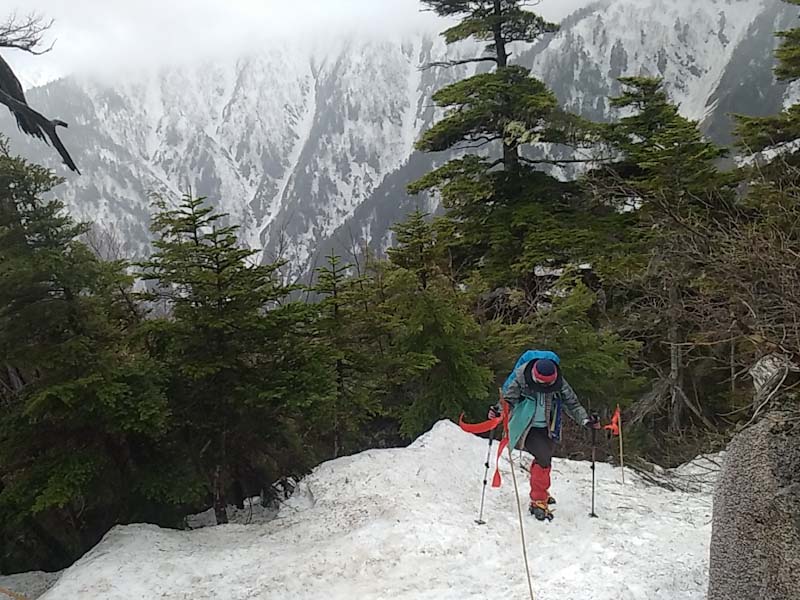 5/9 好天予報で臨んだ燕岳。どうも様子がおかしく曇りがち。第3ベンチでアイゼンを装着。富士見ベンチを過ぎた頃から小雨が降り出した。元々歩き始めから風が強かった。合戦小屋に着いた頃には雨がミゾレになった。横殴りである。判断に悩んだ。しかし、「山ノ神」は、始めから山頂には執着がないし、雪山に自信を付けて欲しいとの思いもあったが、そそくさと撤退する事にした。