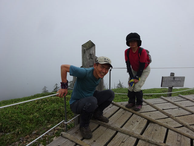 | 三角点 | ガスが掛かって何も見えない山頂で・・ |
