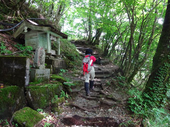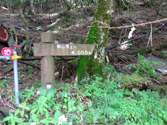 | 剣神社前を通って、登山道に入る。 | 山頂まで4キロです。 |