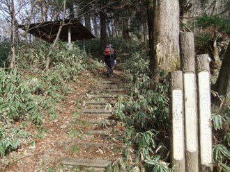 旧参道入口から、八溝川命水群コースへ、 登頂後、日輪寺コースで下山。 |