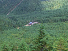 | 赤岳鉱泉 | 青空が見え、山頂付近を振り返るが やはりガスが晴れないようであった。 |